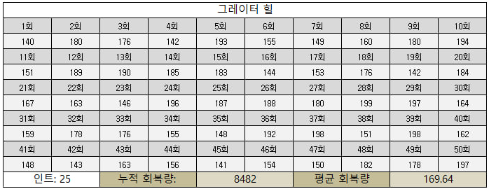 ※ 해당 실험은 그레이터 힐 마법에 대한 회복량 실험입니다.