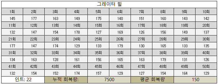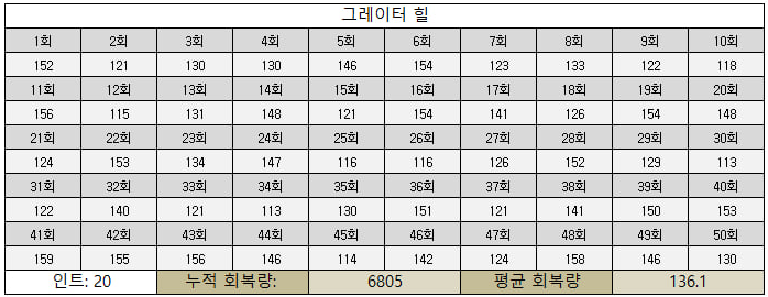 ※ 해당 실험은 그레이터 힐 마법에 대한 회복량 실험입니다.